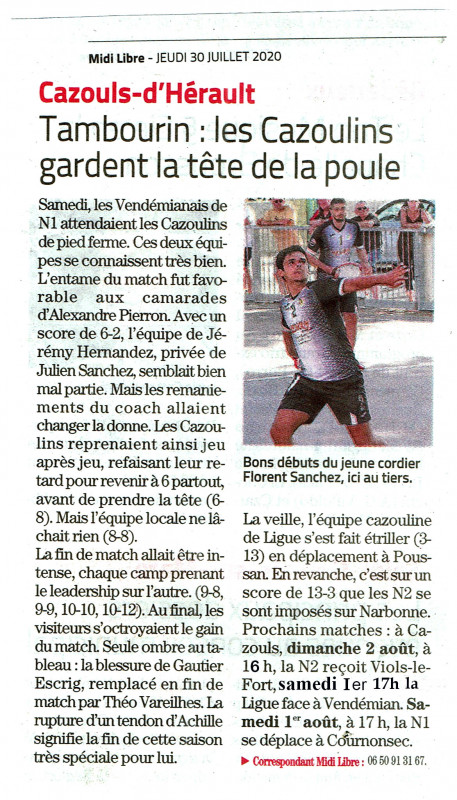 Le gros match se jouera à Cazouls Dimanche 16 Aout à 17h Les Cazoulins recoivent Vendemian pour qui ce match a une valeur de revanche et de test . Cazouls est dorénavent versé pour la seconde phase dans la poule des champions ayant assis leur supériorité à Monceaux sur Dordogne 13 à 5