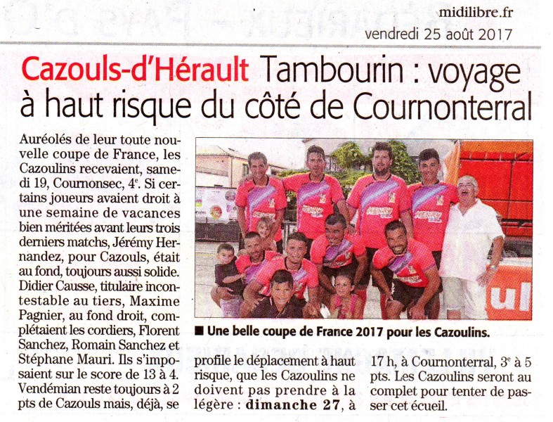Ce dimanche 14 janvier les finales du championnat minimes de l'Hérault en salle avait lieu à Paulhan . Cazouls avait engagé pour la saison 2017 2018 2 équipes de minimes. Ces 2 équipes sont composées de jeunes de Cazouls et d'Usclas. Ce championnat à eu lieu sous forme de plateau. Les 2 équipes en série H 3 et H1 se sont qualifiés pour arriver en Finale ce dimanche matin l'équipe de H3 composée de Cédric Lassus, Rafael Sanchez et José Torrès, a battu les équipes de Montarnaud et St Pons de Mauchien, à chaque match les Cazoulins ont gagné par 13 à 2 pour être sacrée championne de cette série H3. Delphine Goud Finaliste du dernier mondial avec l'équipe de France remis à chaque joueurs les médailles et la coupe de L'équipe de H1 composée de Noa Bernard, Larius Gay Morgane Mauri et Enzo Sanchez entrée sur le terrain l'après midi se retrouvait en finale directe face à Florensac,qui s'est incliné par 5 à 13 . Rappellons que les Benjamins avaient été honnoré dernirement . Quand aux Poussins ils auraient pu obtenir de bons résultats si un changement de convocation les avaient obligé de déclarer forfait .