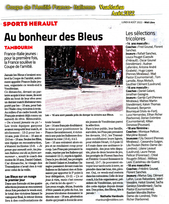 Bien coachés par Florent Sanchez " Cazouls d'hérault" et Frédéric Gounel "Vendémian" les Français se détachèrent inéxorablement pour laisser les italiens à seulement 4 jeux . Dans l'équipe de France à noter 2 joueurs de Cazouls : Rafael Sanchez Capitaine et Louca Pouget remplaçant